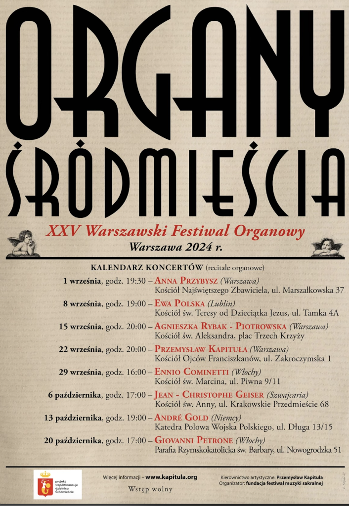 - 1 września 2024, XXV Warszawski Festiwal Organowy „Organy Śródmieścia”, 19:30 w kościele przy Placu Zbawiciela, Warszawa, Marszałkowska 37 , https://kapitula.org/organy-srodmiescia/